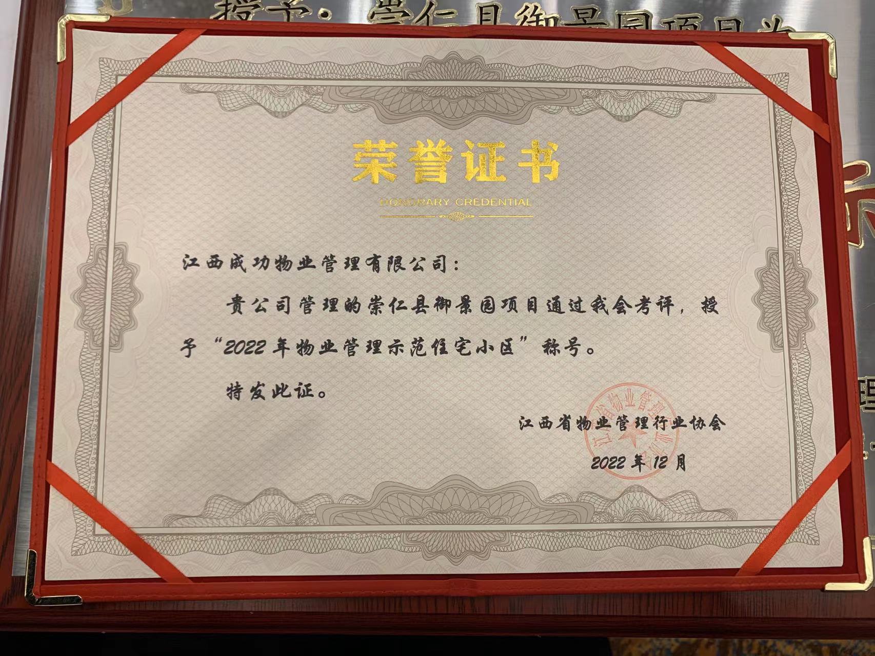近日,成功物业管理的项目——成功·御景园成功获得由江西物业管理行业协会颁发的“2022年年度物业管理示范住宅小区”荣誉,奖牌与证书的取得标志着公司综合